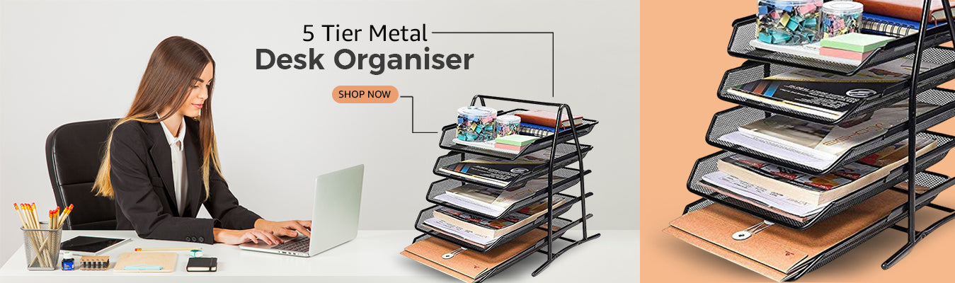 Qatalitic 5 Tier Mesh Metal Desk Organiser File, Rack Letter Tray, A4 Papers, Documents Holder Desk Organizer with slidable compartments for Office-Black