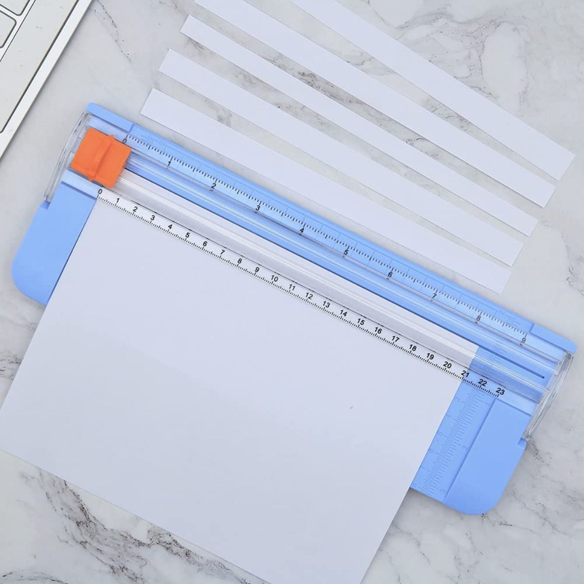 - The blade of the paper trimmer is made of titanium alloy that can be neatly and easily cutting the paper, leaving clean lines without fluff or jagged edges. Present the clean straight cutting along printed line