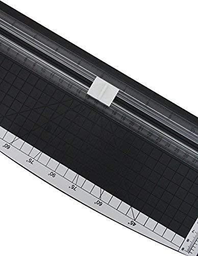 - Color of the Paper Cutting Machine - Black or White; Material - Plastic. Precise Cutting -The paper cutter not only has a centimeter size on the transparent rod, but the base board also has angle and inch measurement, which allows you to cut out accurate paper, labels and photographs.