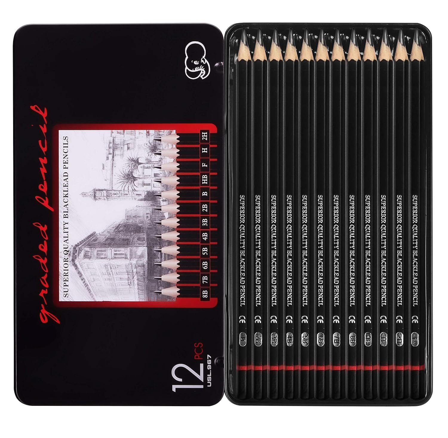 - PACKAGE INCLUDES: Contains 12 Types of sketching pencils B 2B 3B 4B 5B 6B 7B 8B HB H 2H F with metal case to store once you use them so they scatter and misplace them.