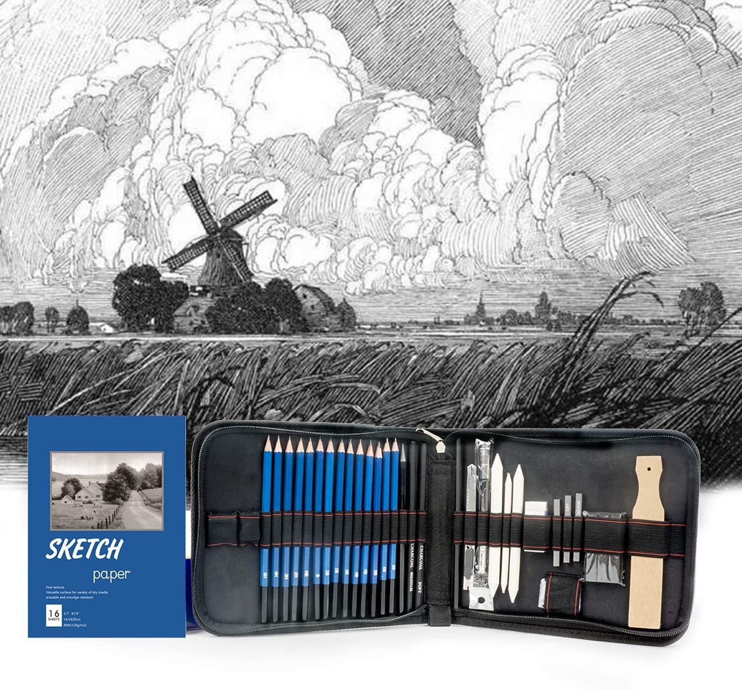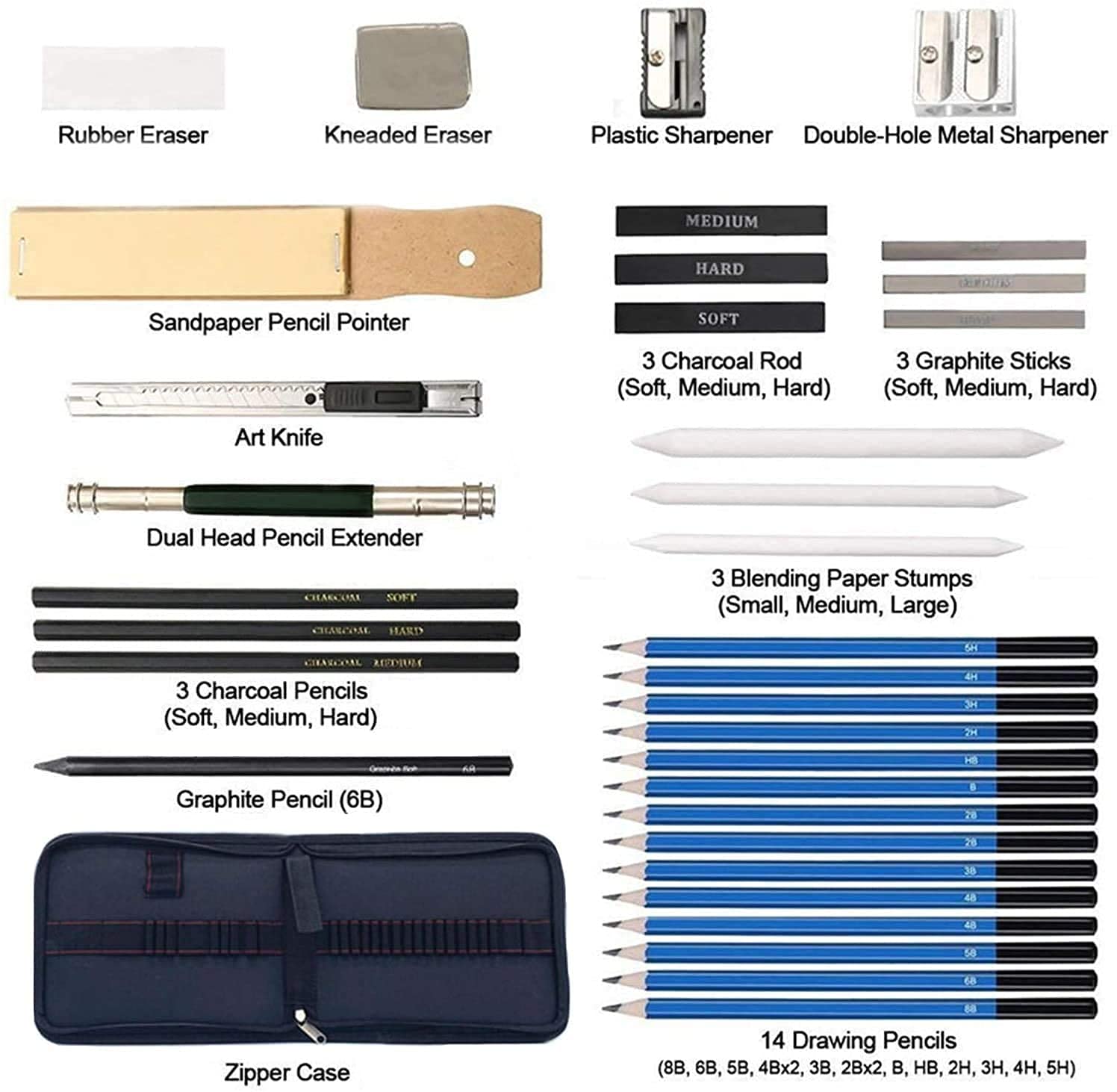 - Complete Set of Drawing Pencils : Complete Set of Sketching Pencils Include: 14 x Drawing Pencil; 1 graphite pencil without wood (6B); 3 x charcoal pencils; 1 x double head extender; 1 x Metal Utility Knife; 3 x stumps of mixing paper; 3 x graphite sticks; 3 x charcoal sticks; 1 x sandpaper; 1 x soft rubber; 1 x white rubber; 1 x Metal Double Hole Pencil Sharpener; 1 x single hole pencil sharpener; 1 sketch paper