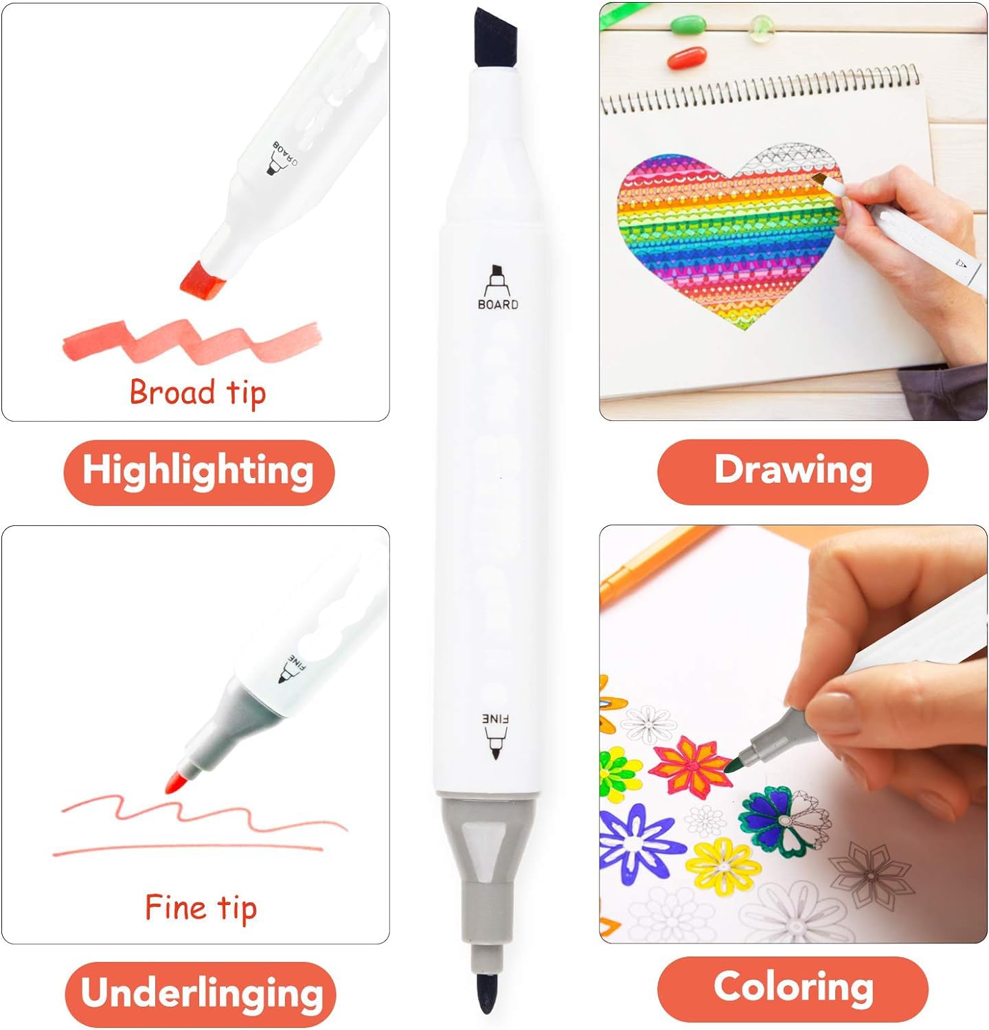 - DOUBLE TIPPED MARKERS, DOUBLE THE FUN: Broad and fine twin tips for precise highlighting and underlining, for drawing with both thin and thick lines. Allows you to create various styles, sketches and patterns with ease.