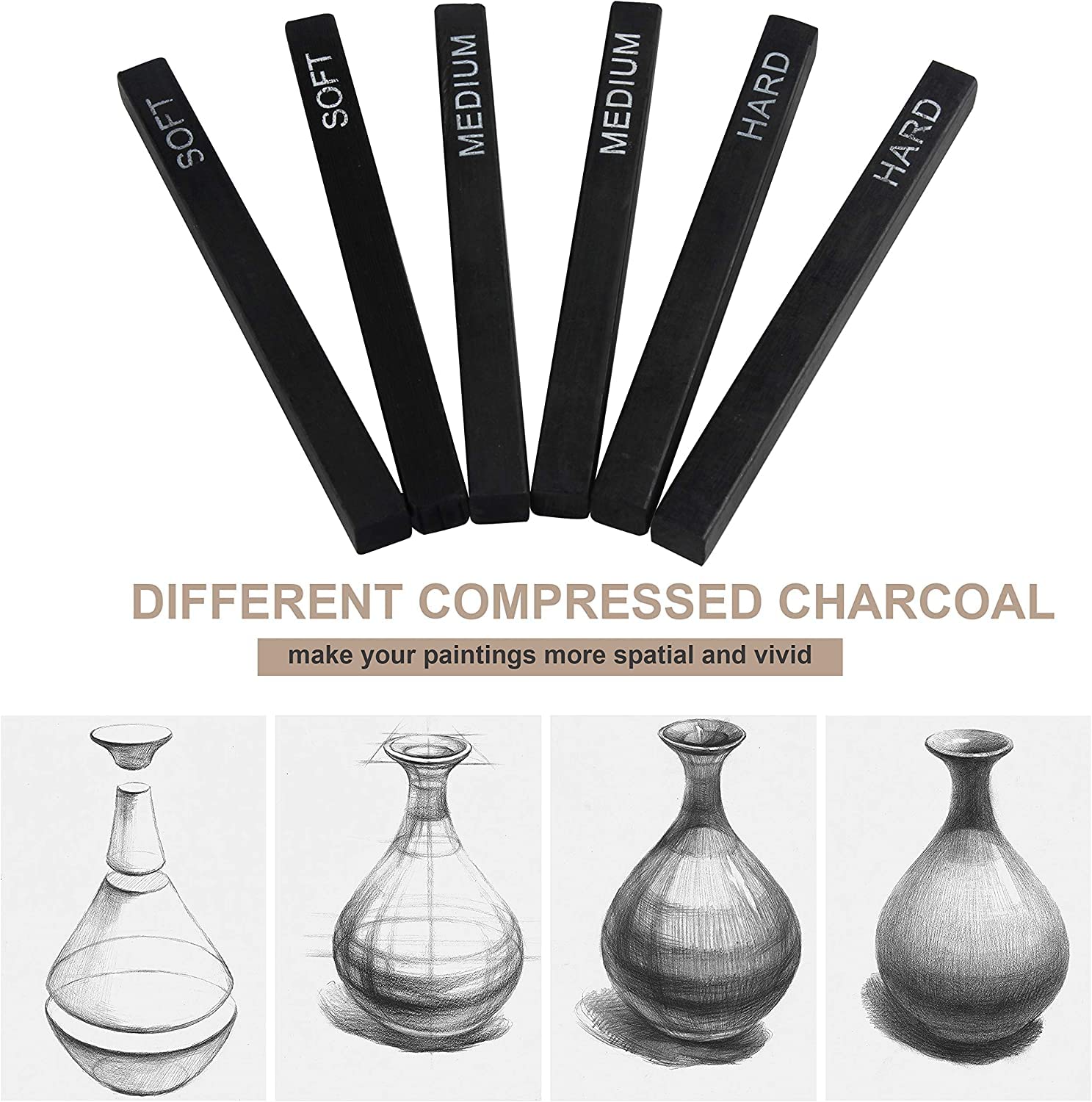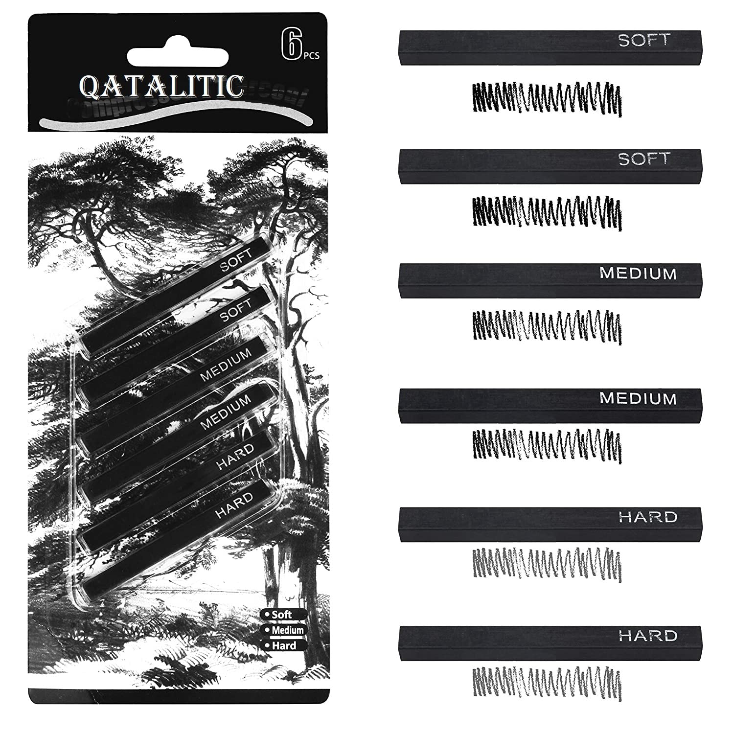 Qatalitic 6 PCS Compressed Charcoal Stick Drawing Charcoal Assorted Hard Medium Soft for Sketching, Drawing, Shading - Black