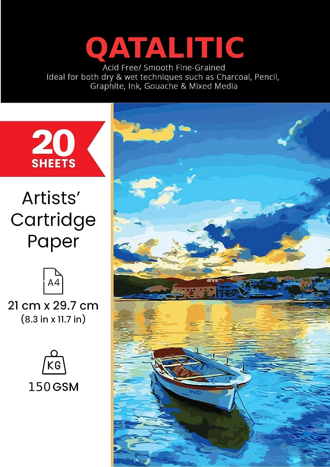 Qatalitic Cartridge A4 White Sketch Paper 150 GSM Set of 20sheets, for Artists, Ideal for Charcoal, Graphite, Acrylic, Watercolor, Gouache, Ink, & Other Mixed Media