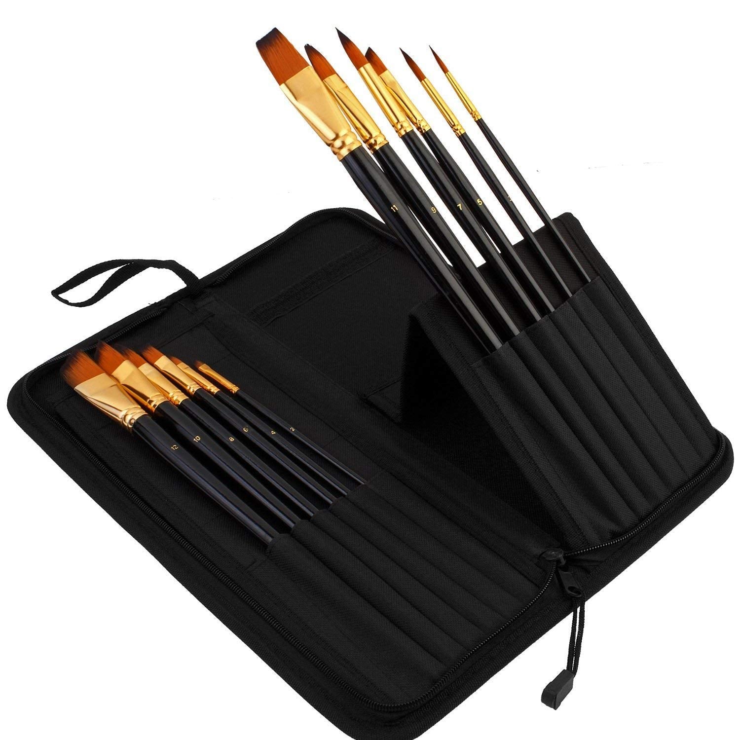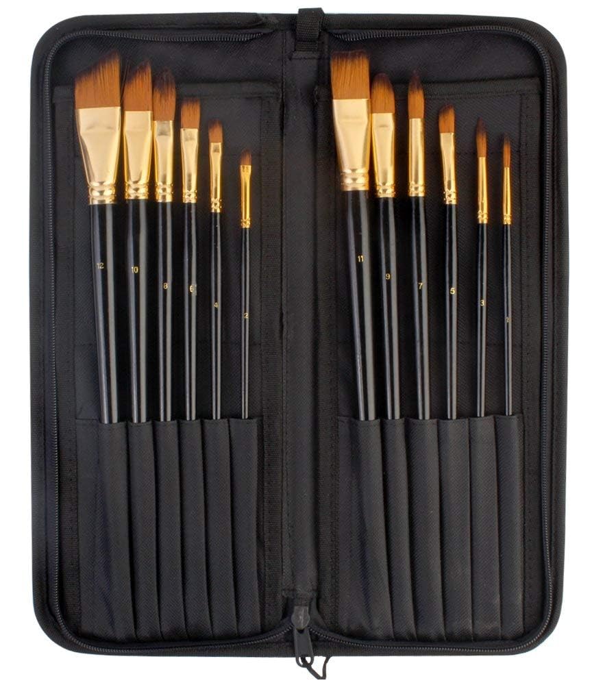 Qatalitic Set of 12 Professional & Exclusive Fine Art Long Handled Premium Paint Brush Set & Zippered Carry Bag with Pop Up Stands for Oil Acrylic Watercolor Painting