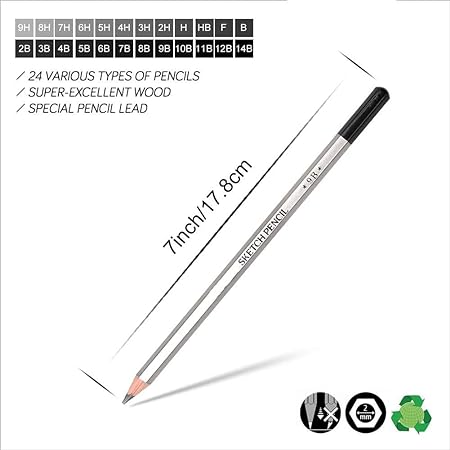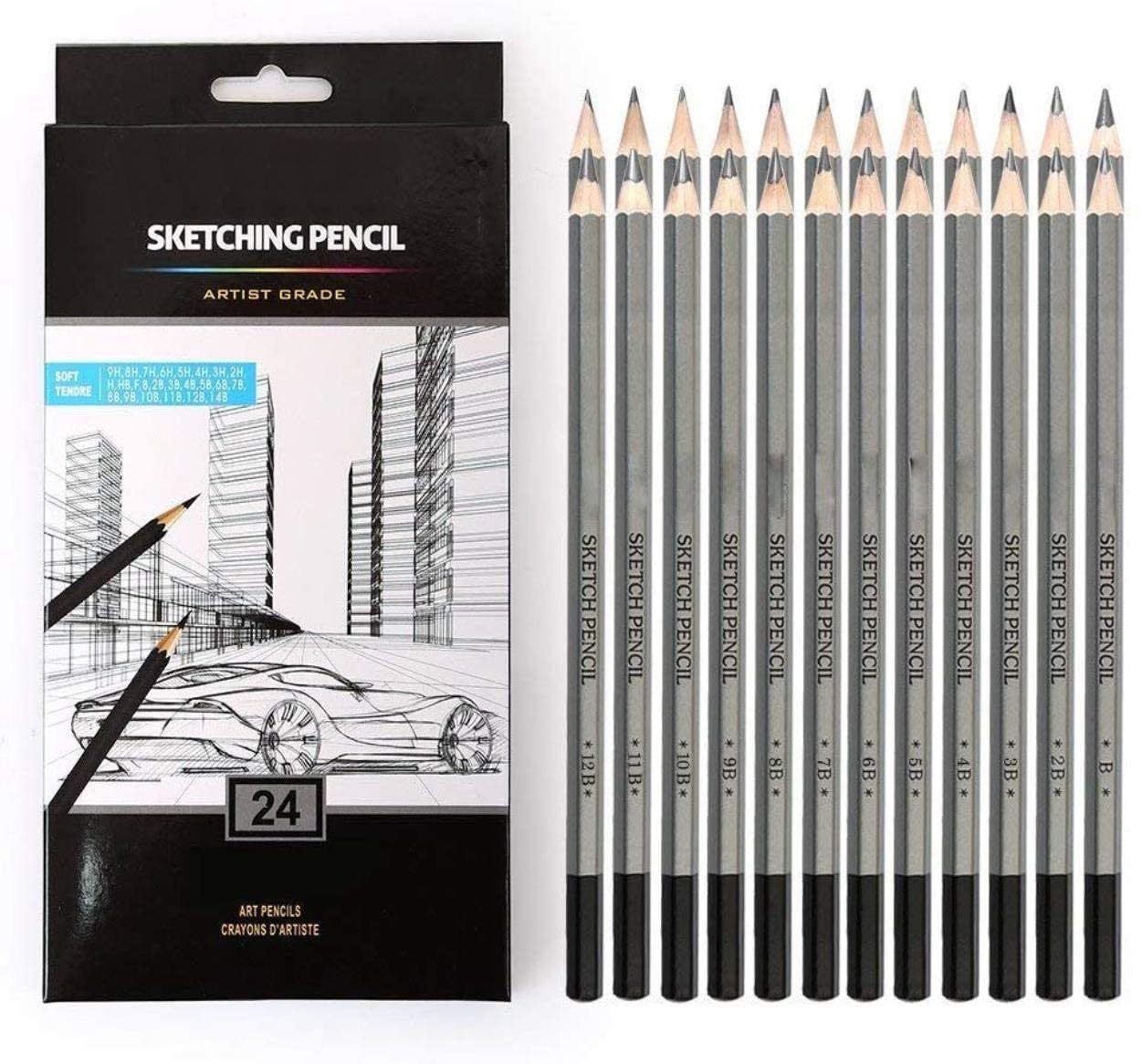 - 24 Graphite drawing pencils for artists kit include every color you need: 14B,12B,11B,10B,9B,8B,7B,6B,5B,4B,3B,2B,B,F,HB,H,2H,3H,4H,5H,6H,7H,8H,9H.