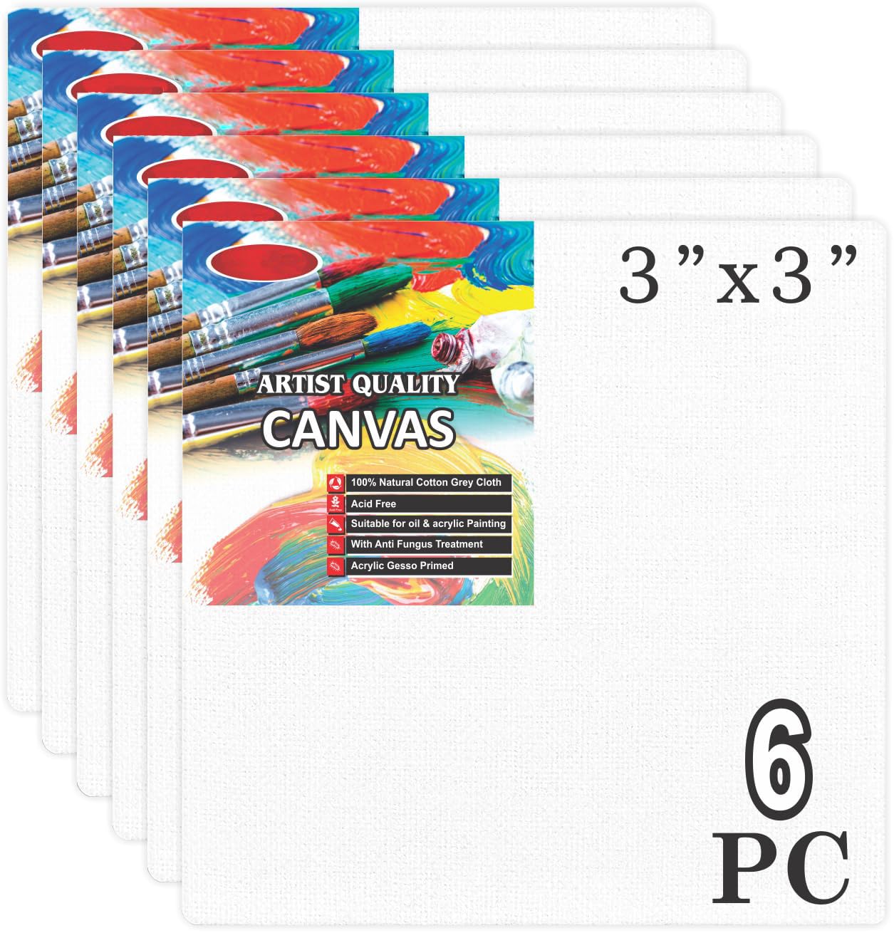 Qatalitic Set of 6 pc. 3 x 3 inch Canvas Board, 100% Cotton, Acid Free, Blank White Mini Canvases for Oil, Acrylic & Watercolour Paint