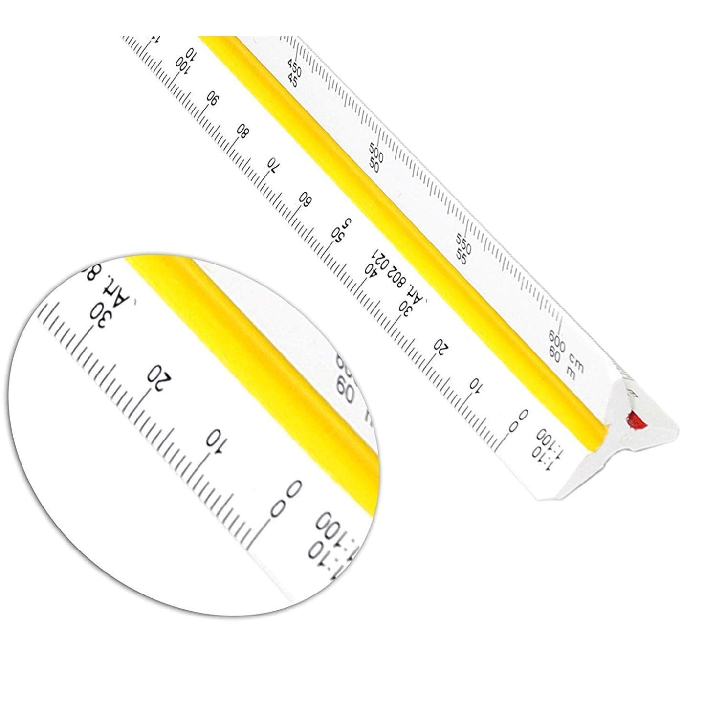 - 30cm / 12inch Triangular scale is made of white plastic with precision divisions and has color coded sides of red and yellow 1:10, 1:20, 1:25, 1:50, 1:75, 1:100, 1:125, 1:200, 1:250, 1:500, 1:750. Dimensions are in (cm) and (m) for easier working