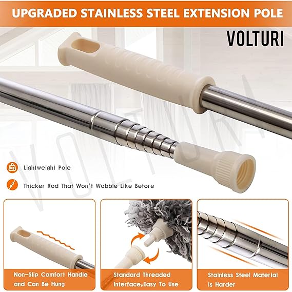 - Extendable Long Pole With high quality 100 inch long stainless steel telescopic pole you dont need to take risks cleaning the high areas anymore just use this duster for cleaning and extend the length of duster pole from 30 to 100 inches to clean the dust easily.